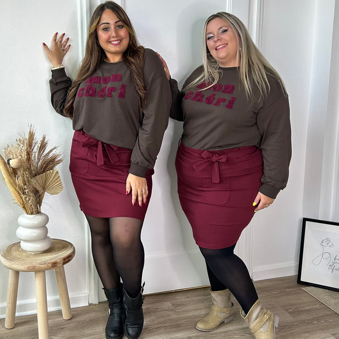 Jupe courte bordeaux ornée d’un nœud