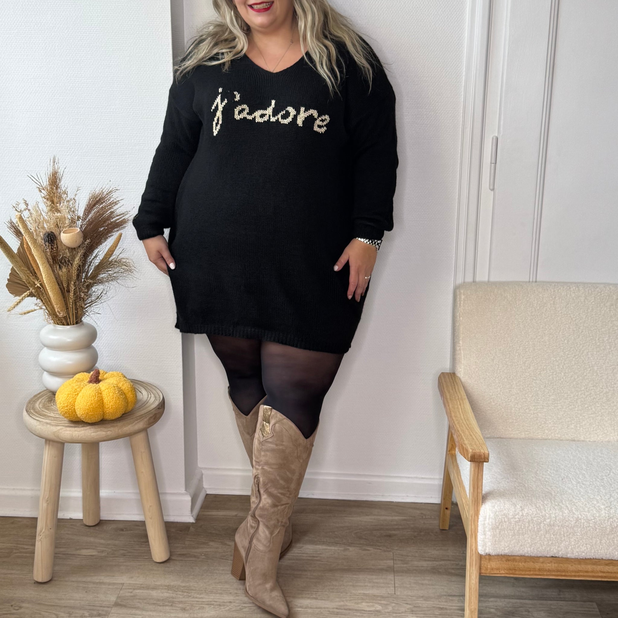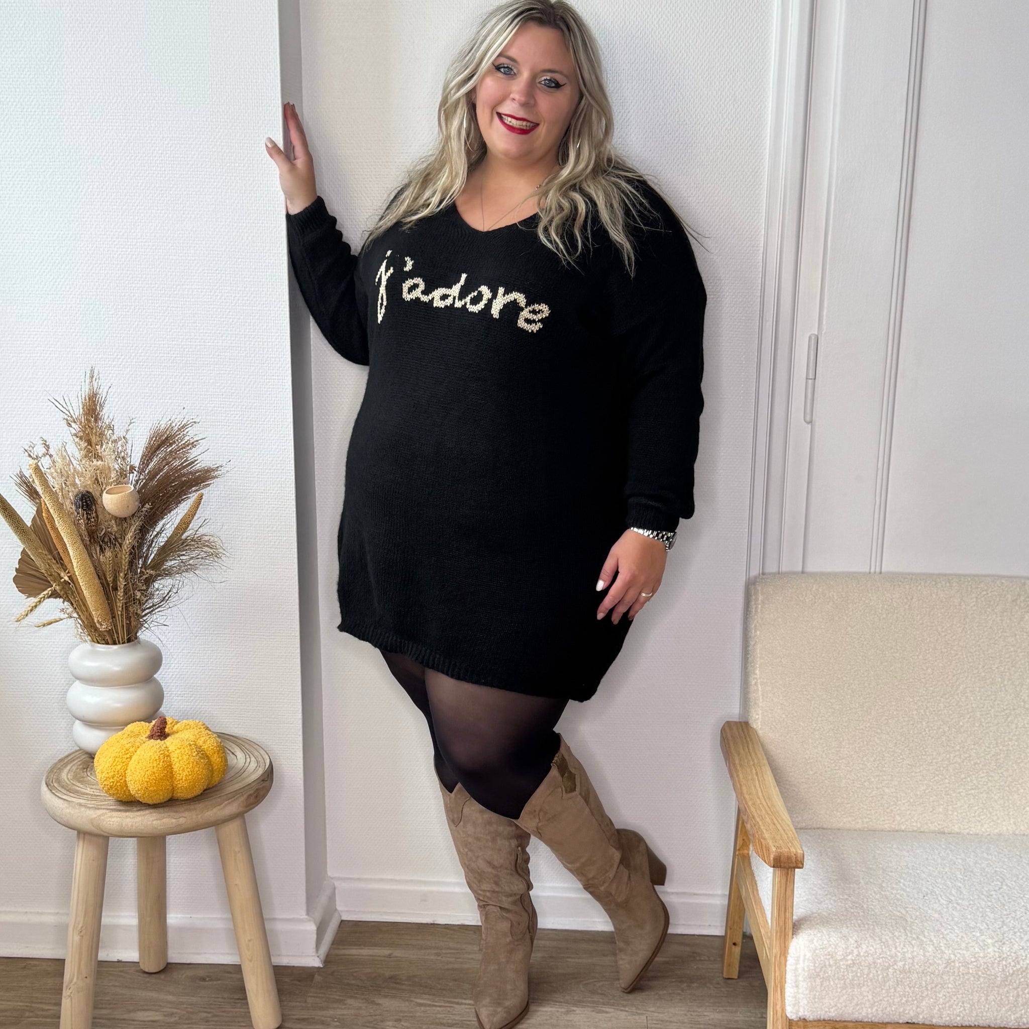 Déborah, en robe pull noir a un tour de mollet de 48 cm (tour de mollet maximum).