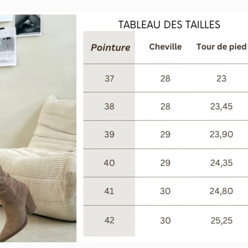 🤠 Adoptez un look western moderne avec les bottes Lavinia ! En suédine beige douce, elles affichent un bout pointu, un talon biseauté de 7 cm et des détails dorés subtils ✨.