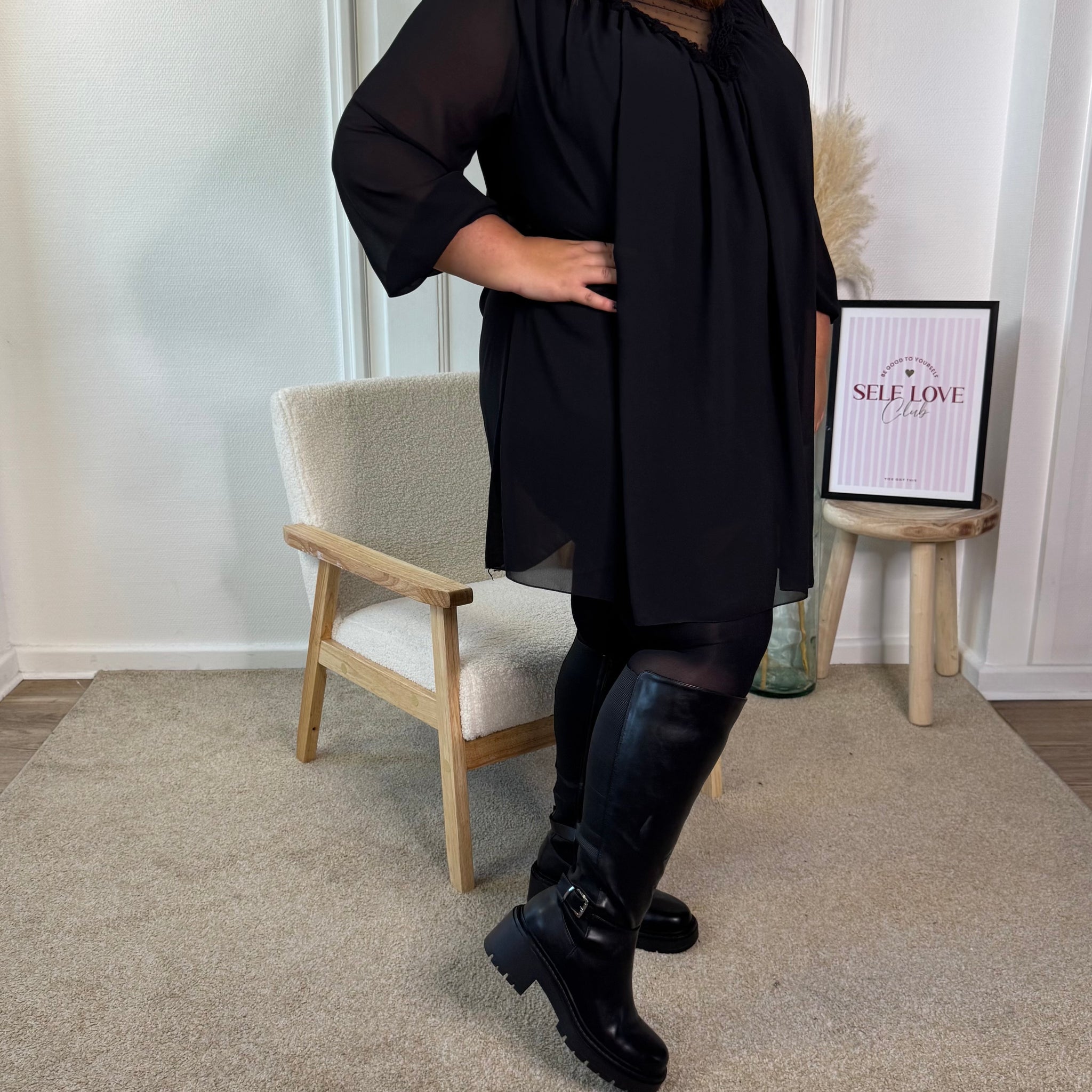 Déborah (robe pull noire) a un tour de mollet de 48 cm pour une taille 39, et Lauryn, également en 39, les bottes leur vont grâce à leur matière stretch au niveau du mollet.