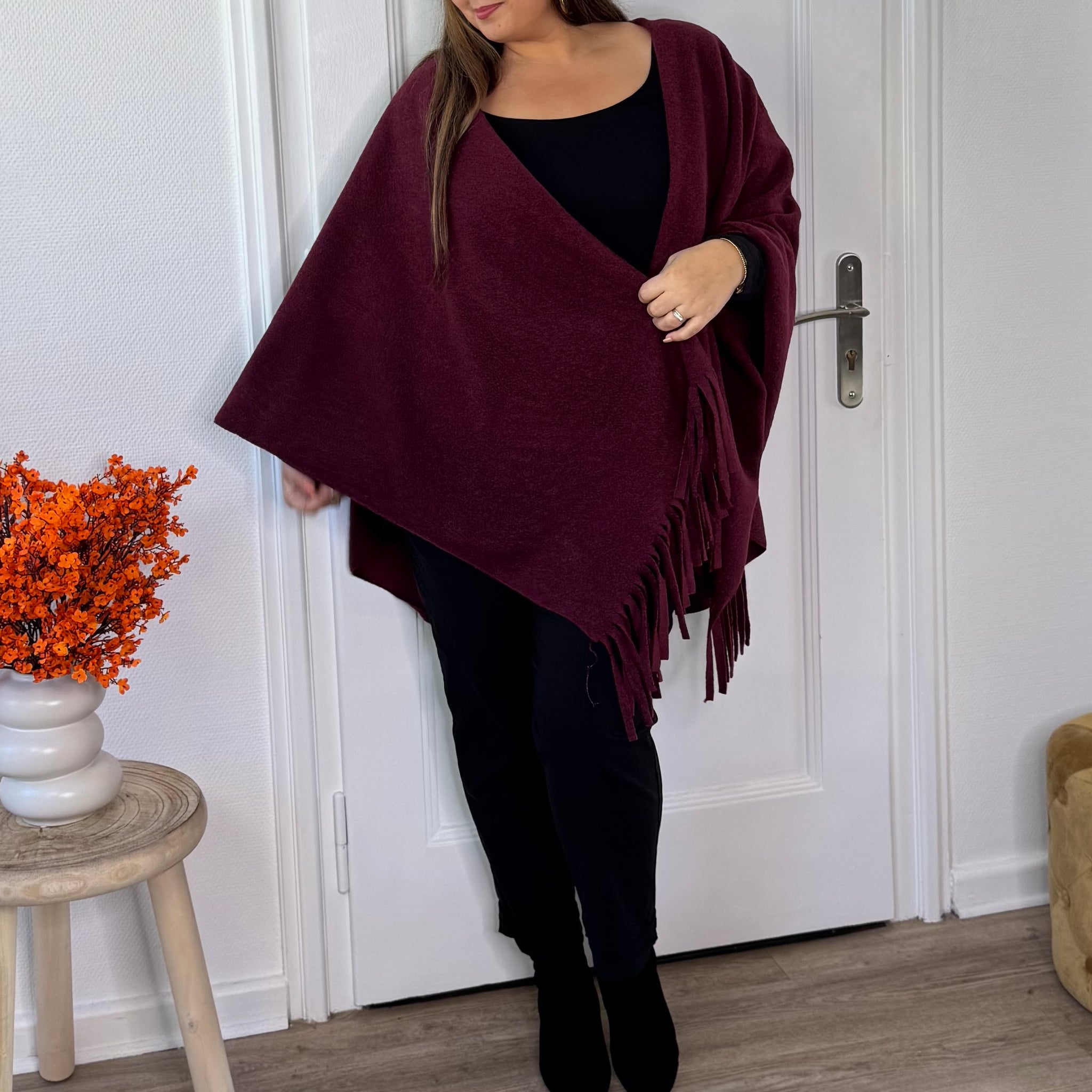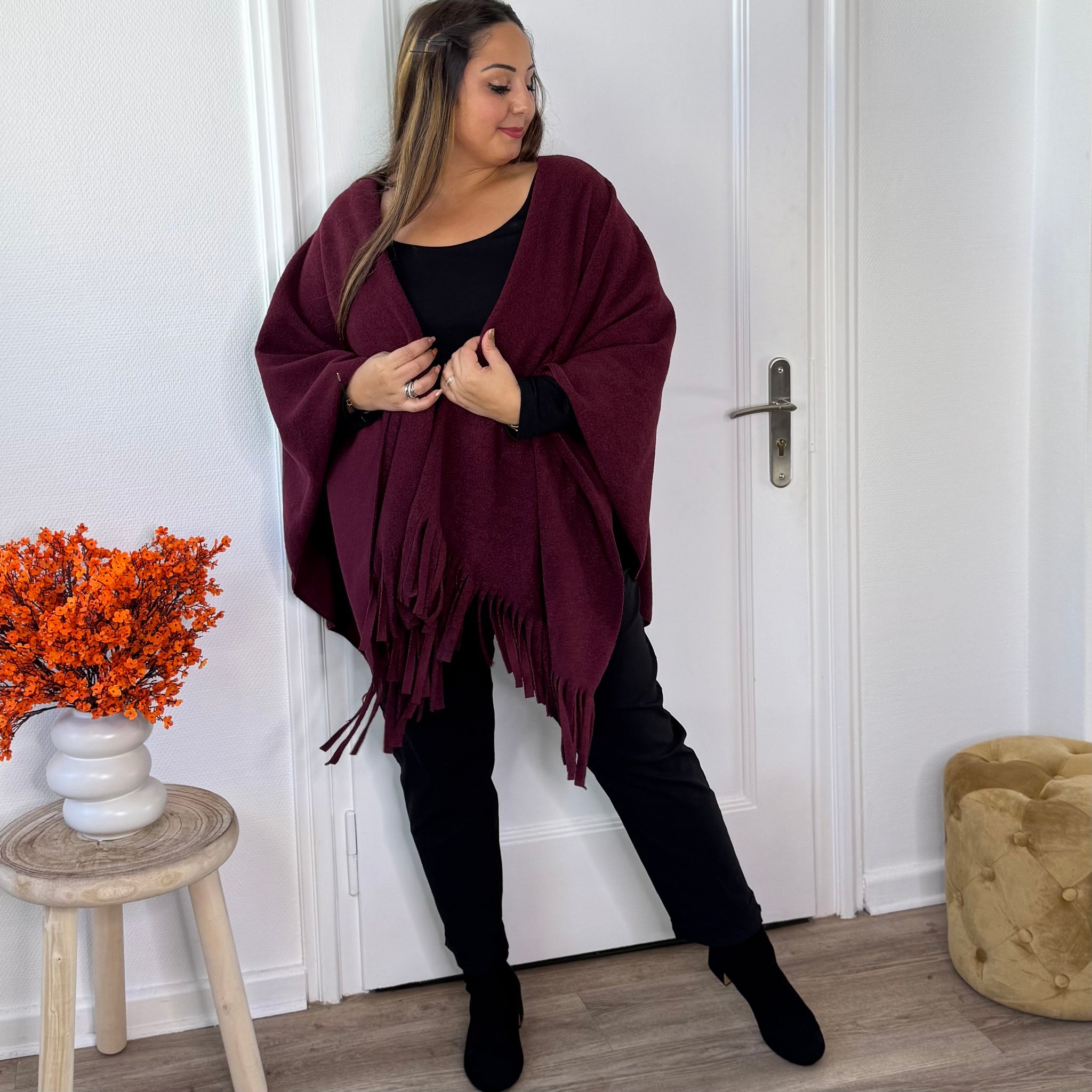 ✨ Apportez une touche de chic et de douceur à vos tenues avec cette veste cape bordeaux fluide, sublimée par de délicates franges au bas de la cape ❤️.