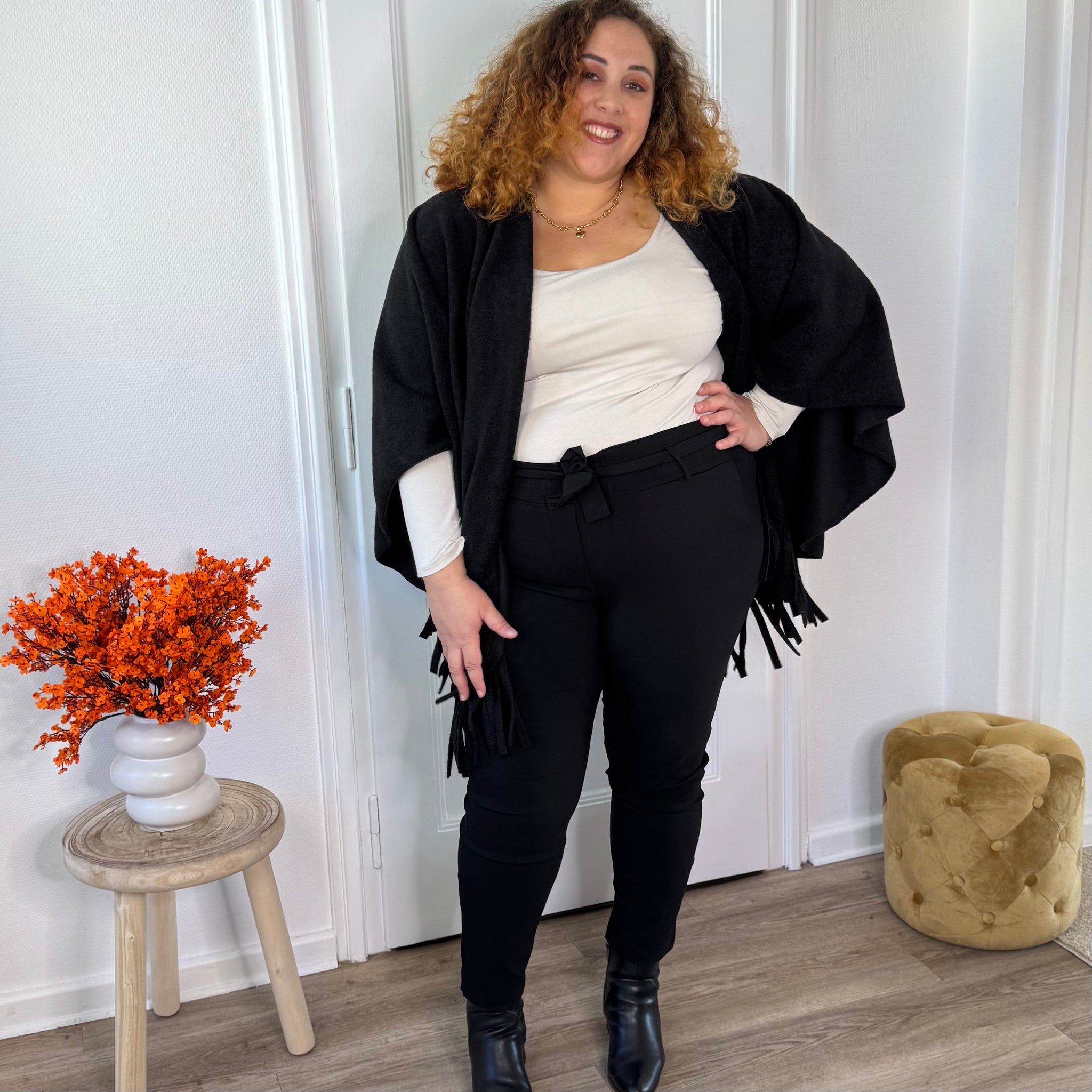 ✨ Apportez une touche de chic et de légèreté à vos tenues avec cette veste cape noire fluide, sublimée par de délicates franges au bas de la cape 🖤.