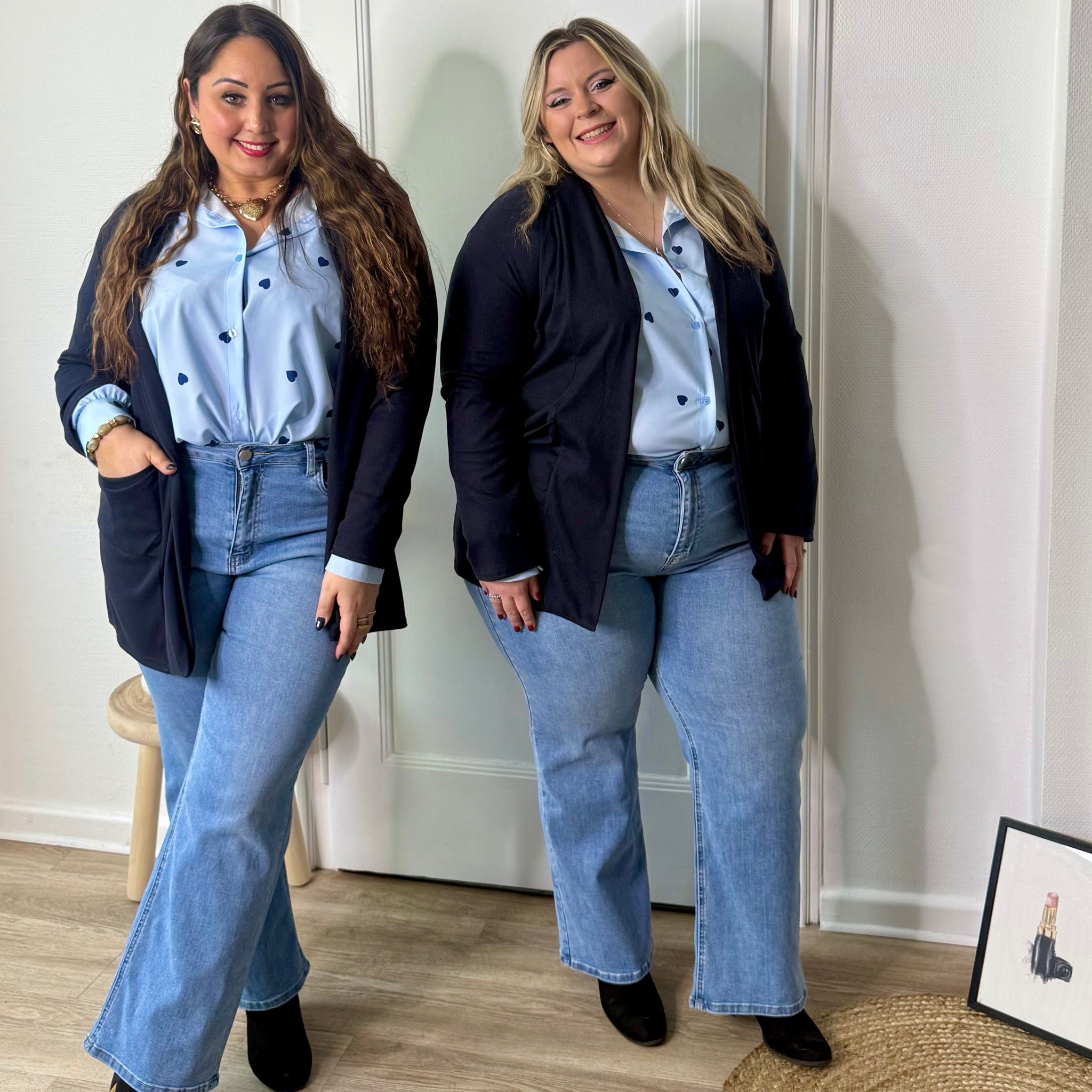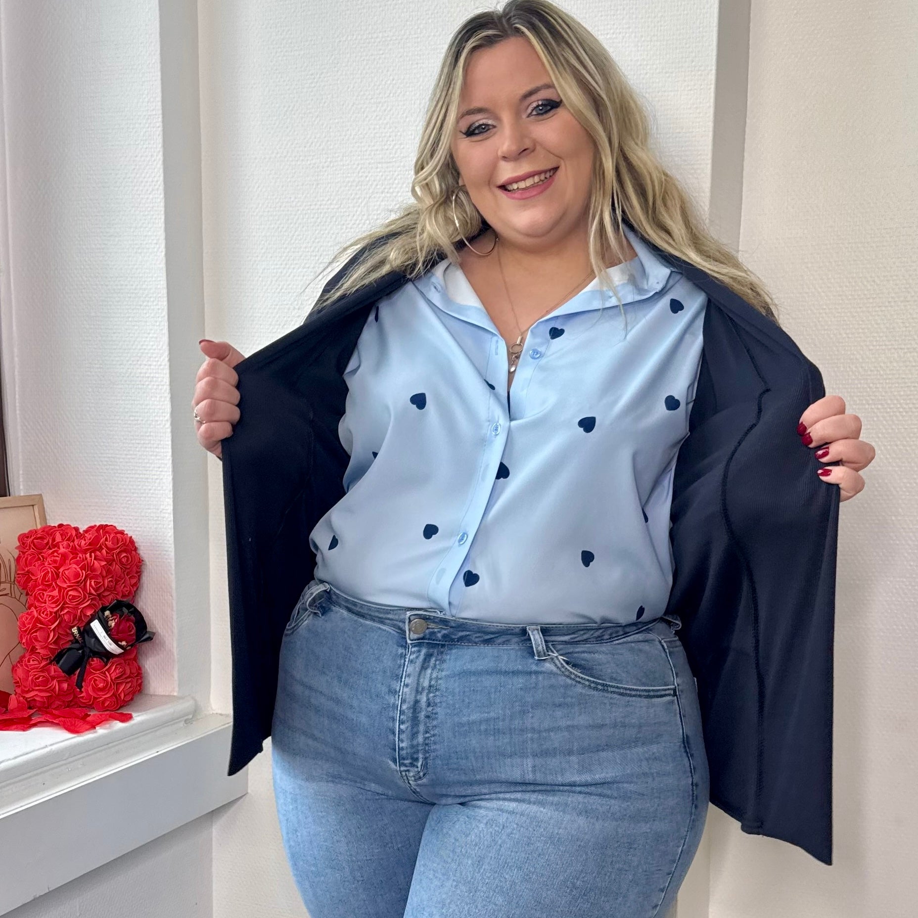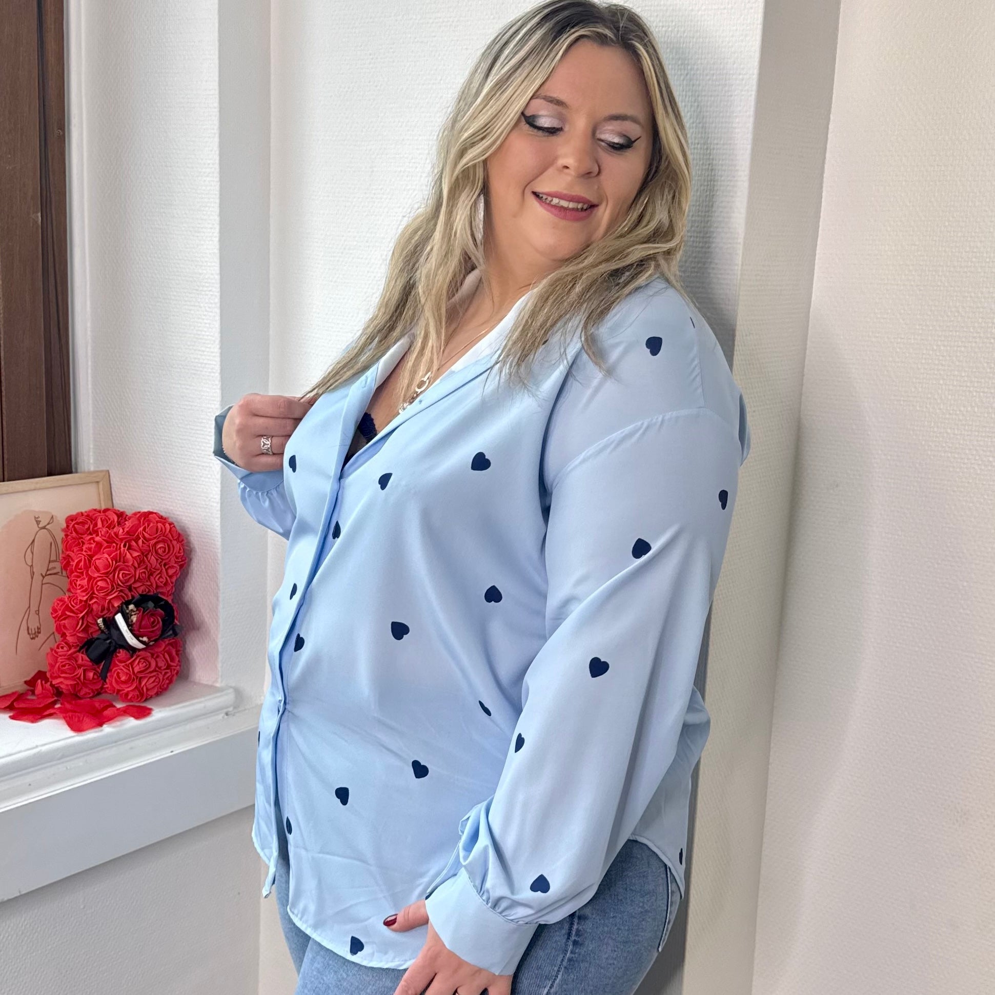 Frais et délicat, ce chemisier bleu clair est orné de jolis cœurs bleu foncé, pour une touche douce et élégante 💙✨. Sa matière fluide et légère offre un tombé agréable et un confort optimal tout au long de la journée 🌿💫.