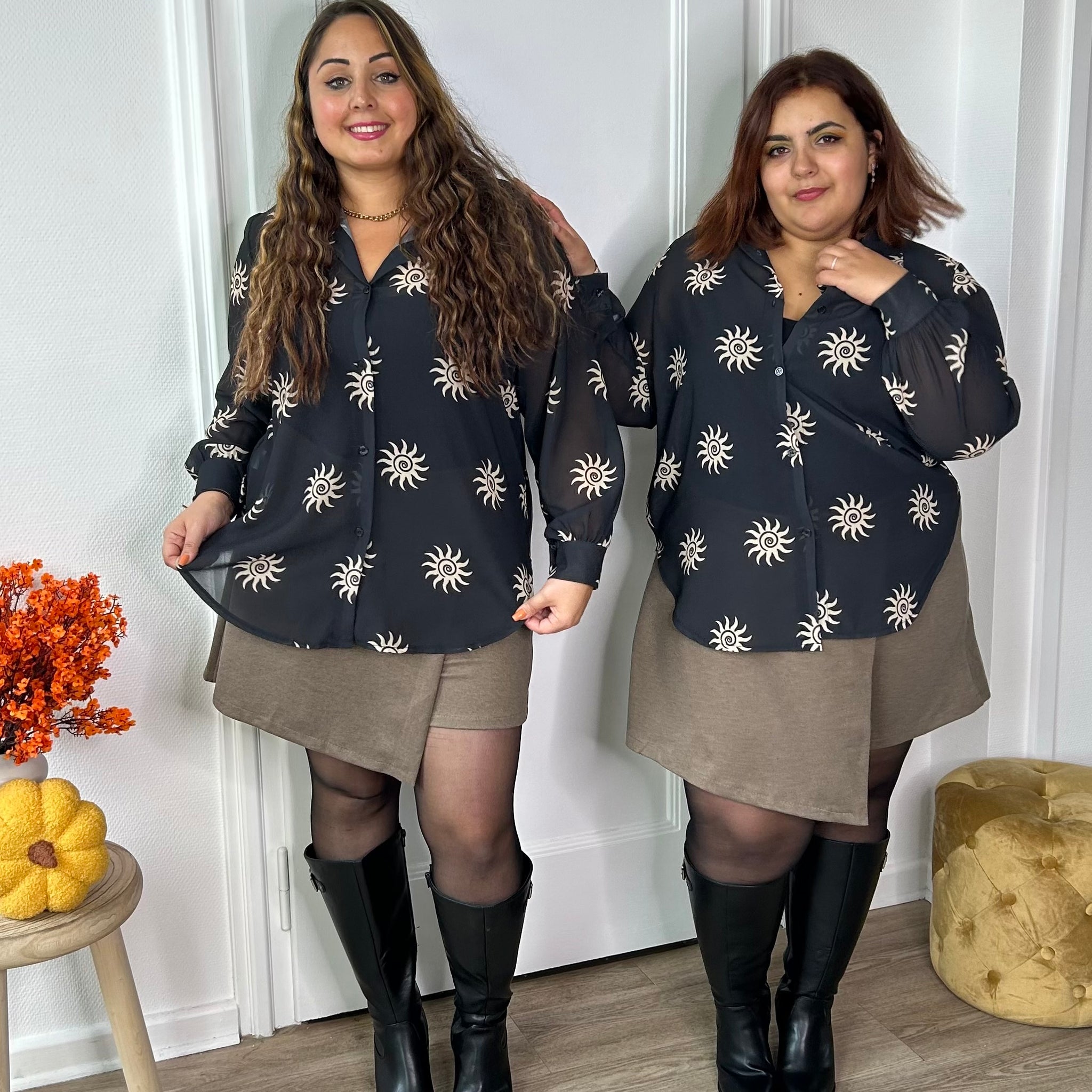 Adoptez l’élégance avec ce chemisier noir fluide et léger, orné d’imprimé soleil doré qui capte la lumière ✨.