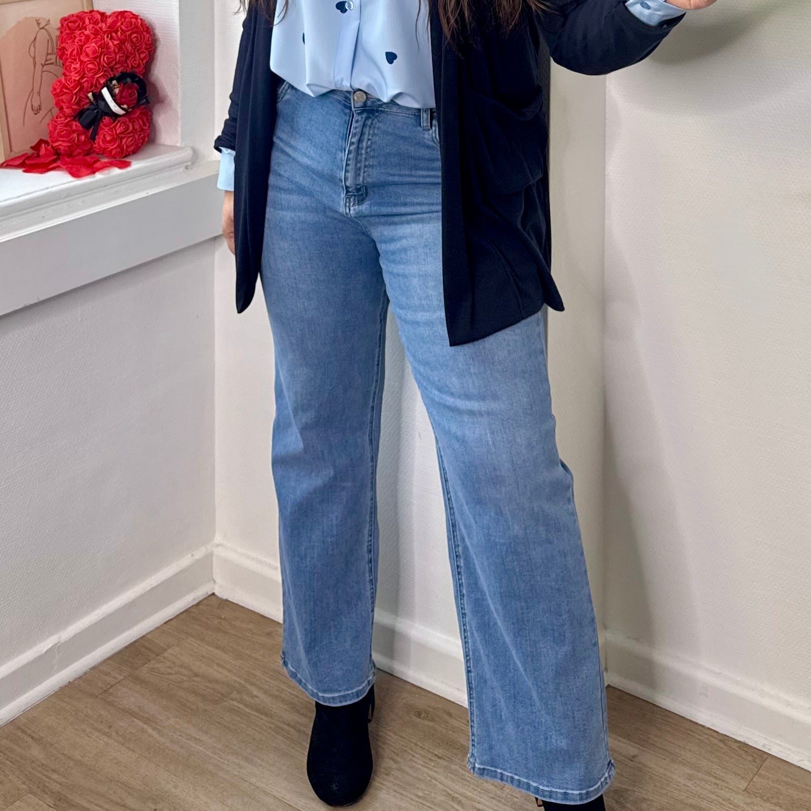 Tendance et facile à porter, ce jean clair séduit par sa coupe droite légèrement évasée sur le bas, idéale pour allonger la silhouette 👖✨. Il est élastique, confortable et stylé, il s’adapte à toutes vos tenues, du look casual au plus habillé 🌿💙.