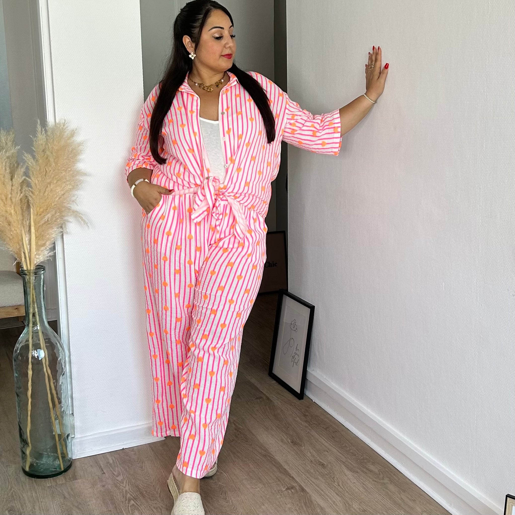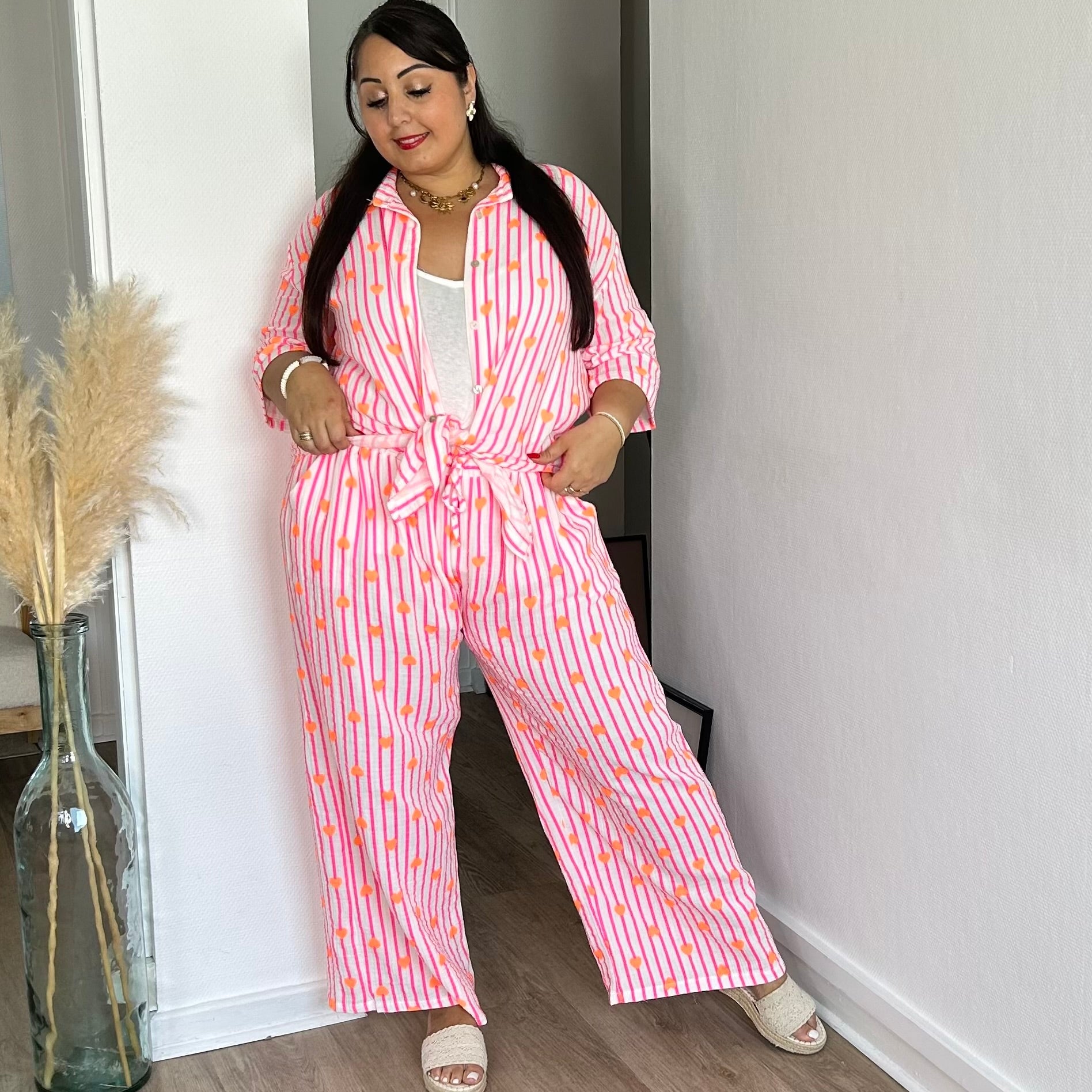Envie de confort sans faire l’impasse sur le style ? Ce pantalon fluide à rayures et imprimé cœur est fait pour vous 💕 ! Léger et agréable à porter, il se distingue par sa coupe décontractée et sa taille resserrée qui souligne joliment la silhouette ✨. Il est doté de poches.