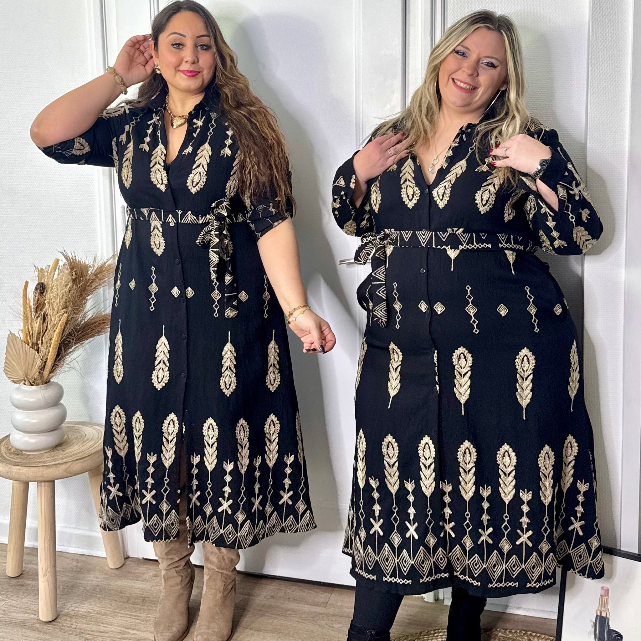 Chic et élégante, cette robe chemise longue noire sublimée par un imprimé doré apporte une touche raffinée à votre silhouette ✨🖤. Les manches peuvent être retroussées grâce à un bouton, elle est également dotée de poches.