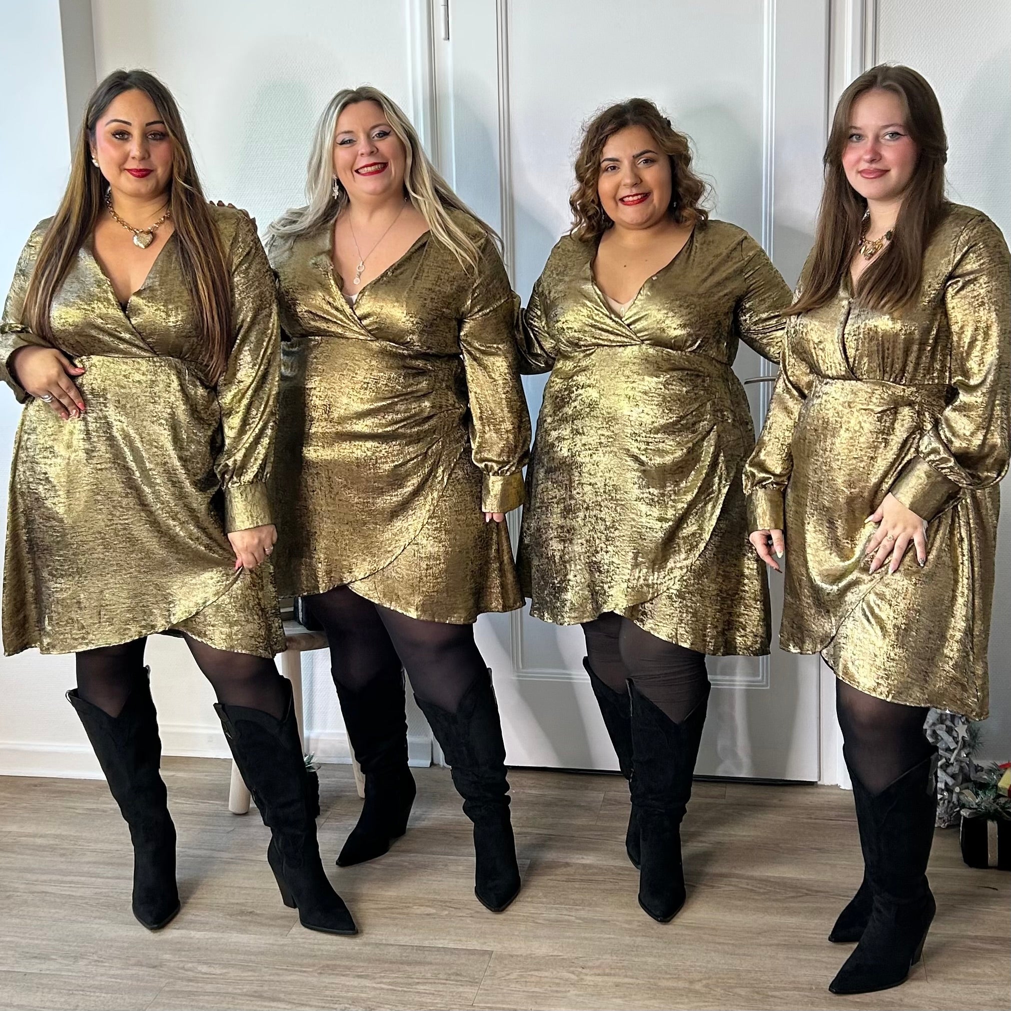 Faites briller votre look avec cette robe courte dorée, aussi élégante que lumineuse ✨ Son col V flatteur et son bouton à la poitrine ajoutent une touche raffinée, tandis que sa coupe fluide offre un tombé léger et féminin. Une pièce chic qui illumine vos occasions du quotidien ou de soirée 😉