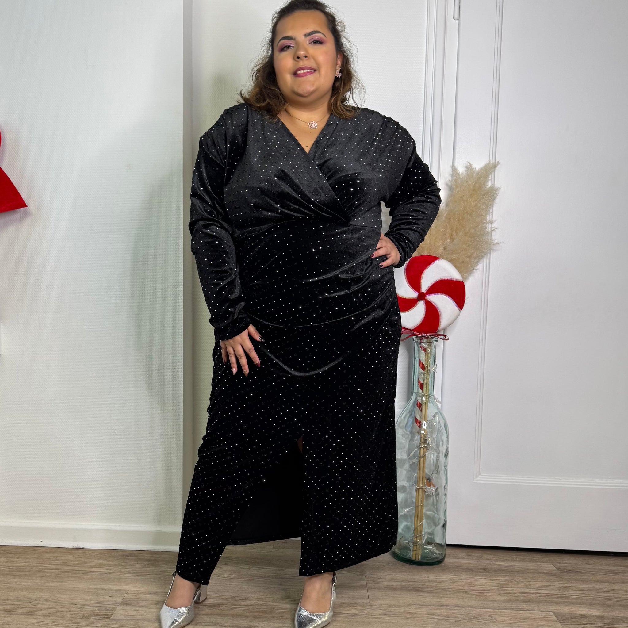 Sublimez votre silhouette avec cette robe en velours à strass, le choix idéal pour briller lors de vos événements. Dotée d’un col V flatteur et d’une coupe portefeuille à l’avant, elle souligne vos courbes avec sophistication. Une petite fente délicate ajoute une touche de sensualité, tandis que son tissu doux et stretch garantit un confort optimal tout au long de la soirée.