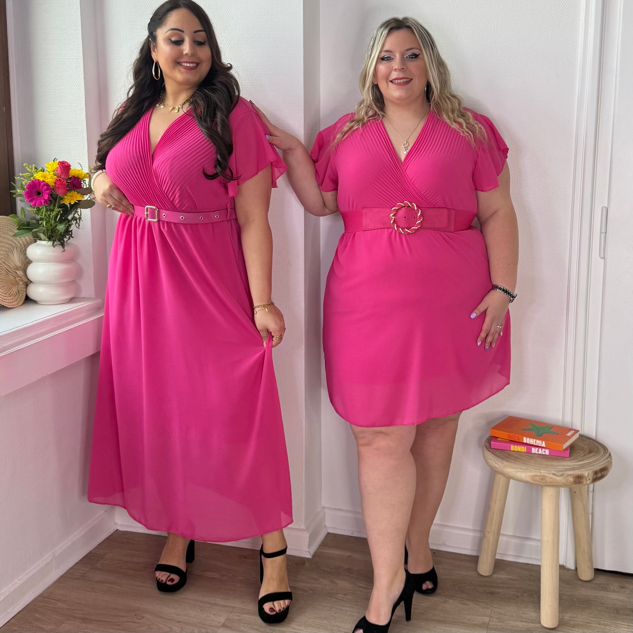 Lumineuse et féminine, cette robe longue fuchsia séduit par son col plissé et son col V flatteur 💖✨.
