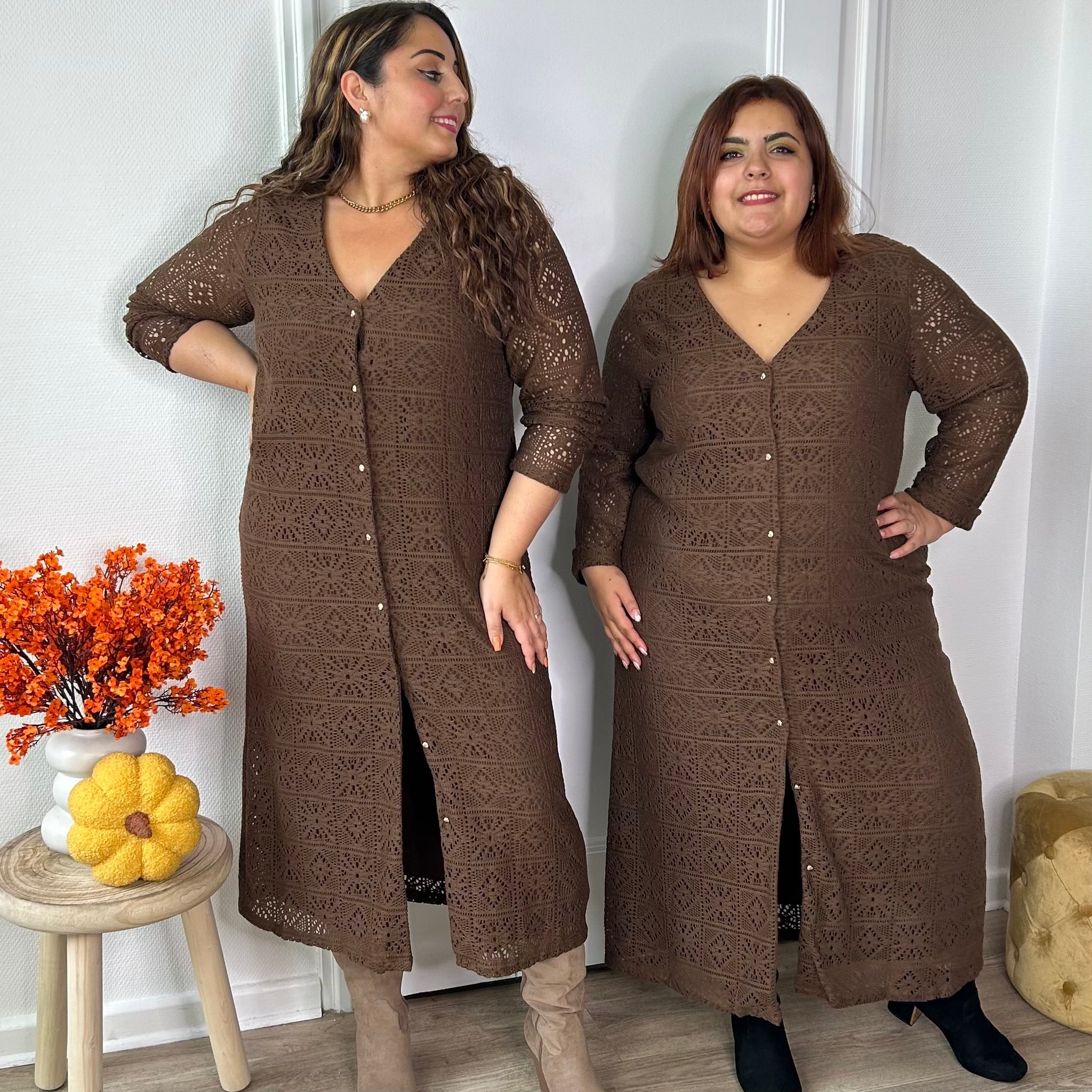 Laissez-vous séduire par cette robe longue en crochet au coloris chocolat gourmand, à la fois douce et raffinée 🍫.